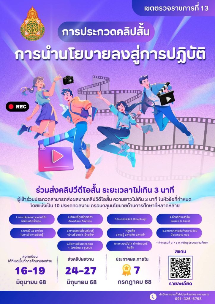เขตตรวจราชการที่ 13 เชิญชวนประกวดคลิปสั้นการนำนโยบายลงสู่การปฏิบัติความยาวไม่เกิน 3 นาที โดยแบ่งเป็น 10 ประเภทผลงาน